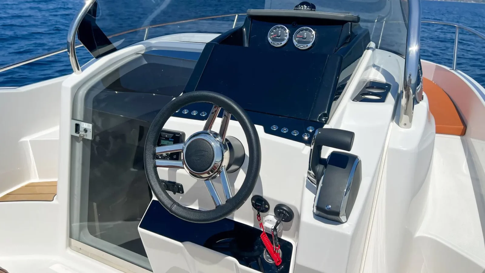 Standard Equipment: Navigation/illumination lights, marine horn, bilge pump, stainless steel cleats/rails, hydraulic steering, marine-grade switches, compass, USB/12V sockets, and Deluxe steering wheel.