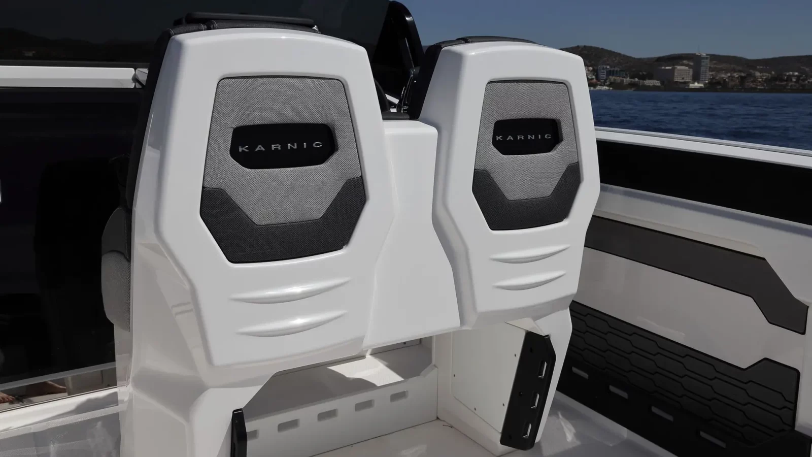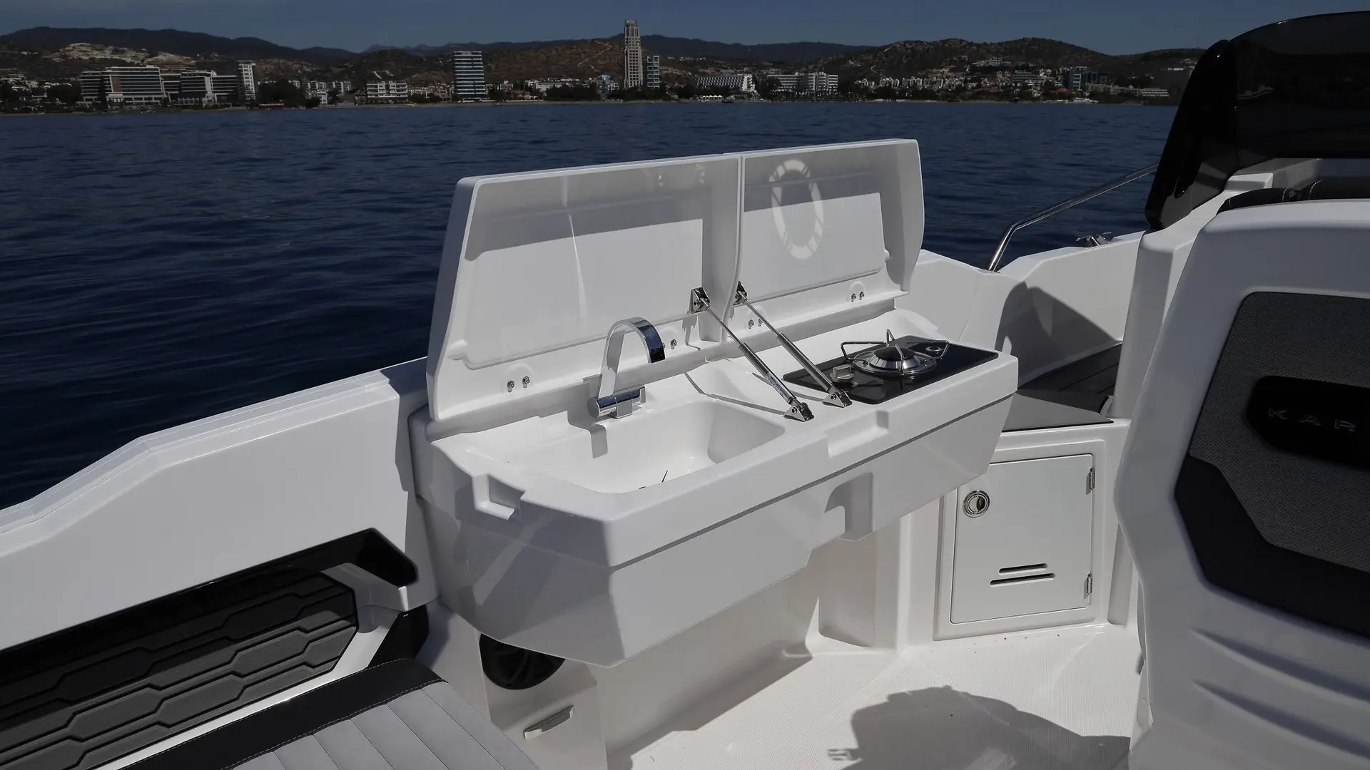 R8-S Model Blank boat Port Gunwale with Galley & Sink Single burner gas stove ceramic top Igloo coolbox 54 Liter, under galley installation Sunstone Deep orange/ Beige shades for cushions / interior Bow Full size sunbed with adjustable backrests Cockpit Jump seat on starboard Cabin teak table removable to cockpit Seadek floor package for swim platforms Seadek floor package for bow sunbed sides Seadeck floor package for cockpit floor Manual marine toilet with holding tank Hydraulic steering connection with venting Cockpit and bow walkthrough blue led lights External styling blue LED lights Anchor Windlass (not including anchor and chain) Battery 100ah x 2 with concealed master switch Bimini Top for helm and cockpit Bimini side shadow covers Sunbed weather protection covers Stern seat backrest weather protection cover Portlight mosquito screens x 3 Console and Helm Cover