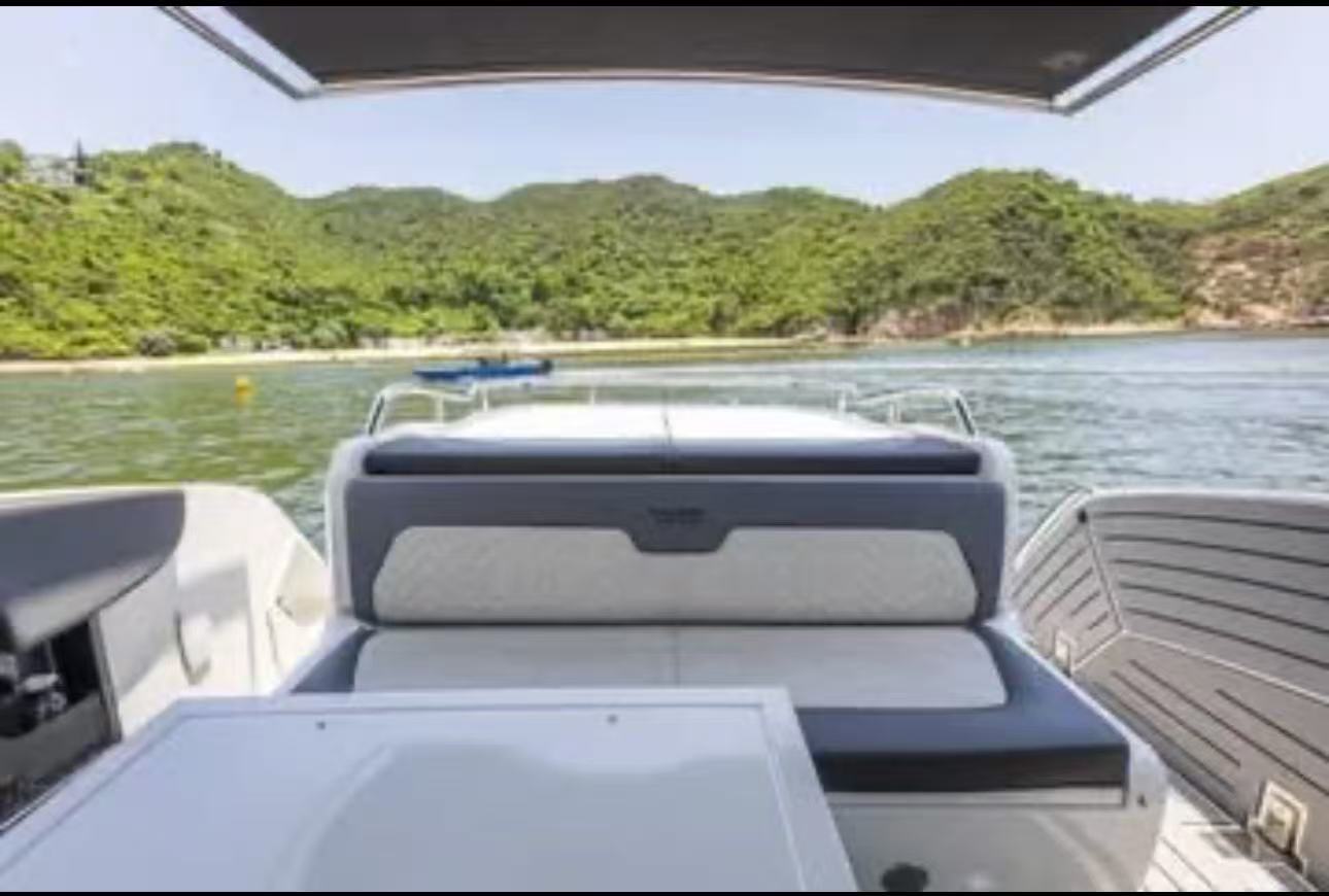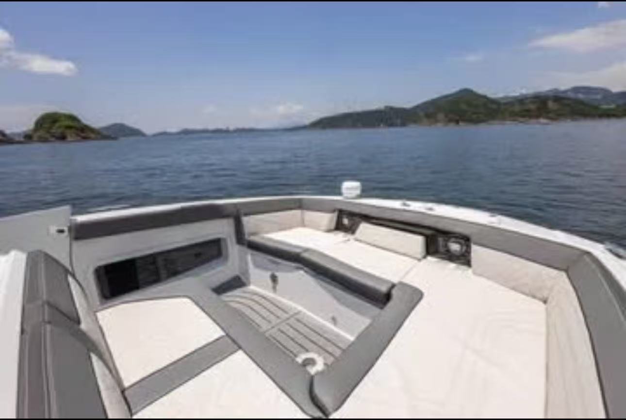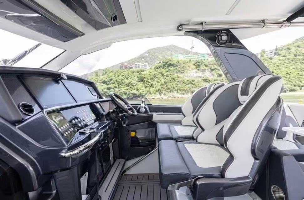 它不像傳統尖頭船,而是採用了方形寬體船頭 (Square Bow),這讓前面的座位區變成了一個巨大的 U 型沙發,甚至可以選配桌子變成用餐區。