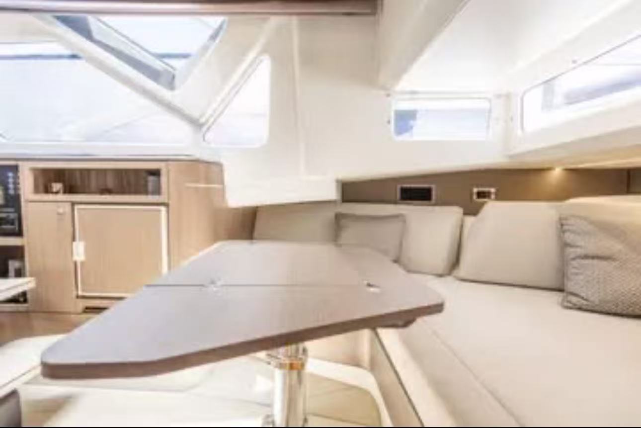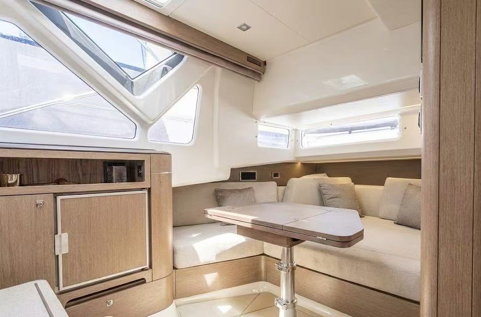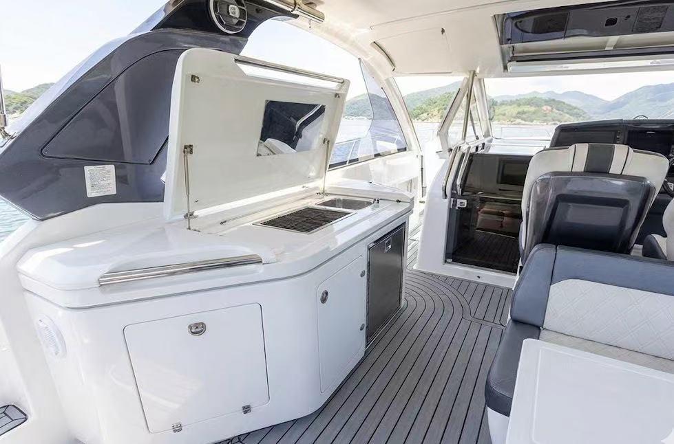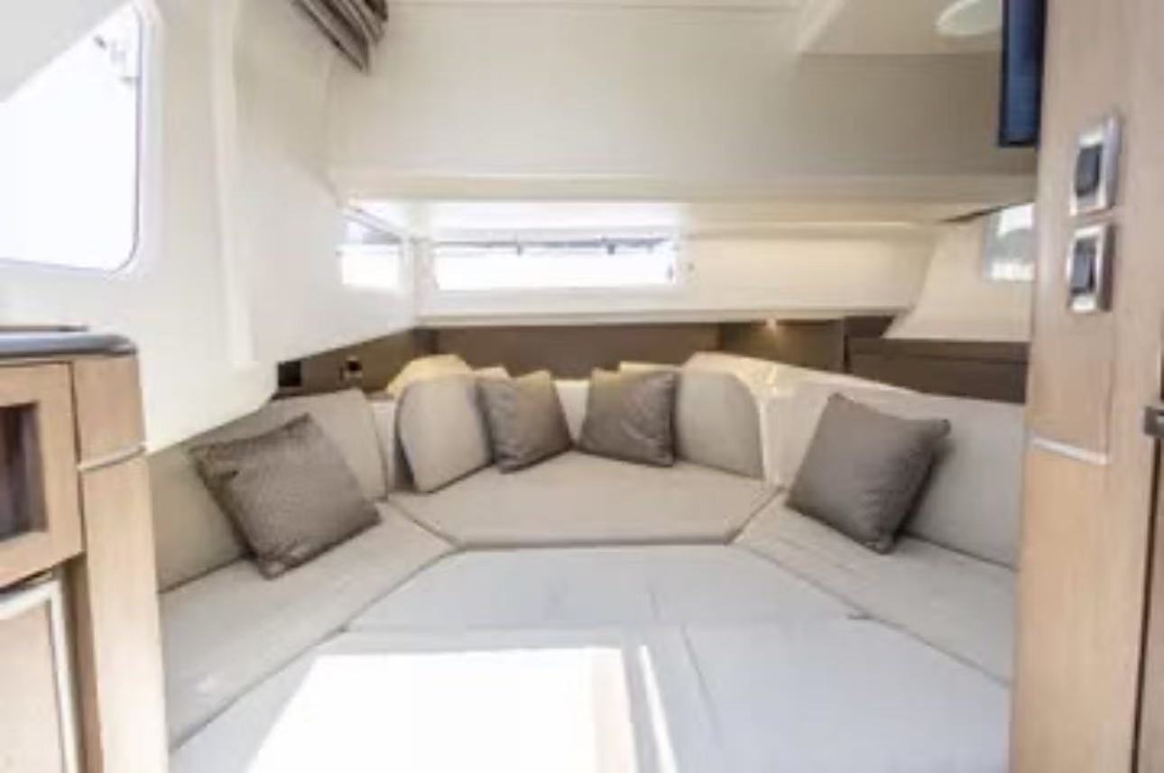 它不像傳統尖頭船,而是採用了方形寬體船頭 (Square Bow),這讓前面的座位區變成了一個巨大的 U 型沙發,甚至可以選配桌子變成用餐區。