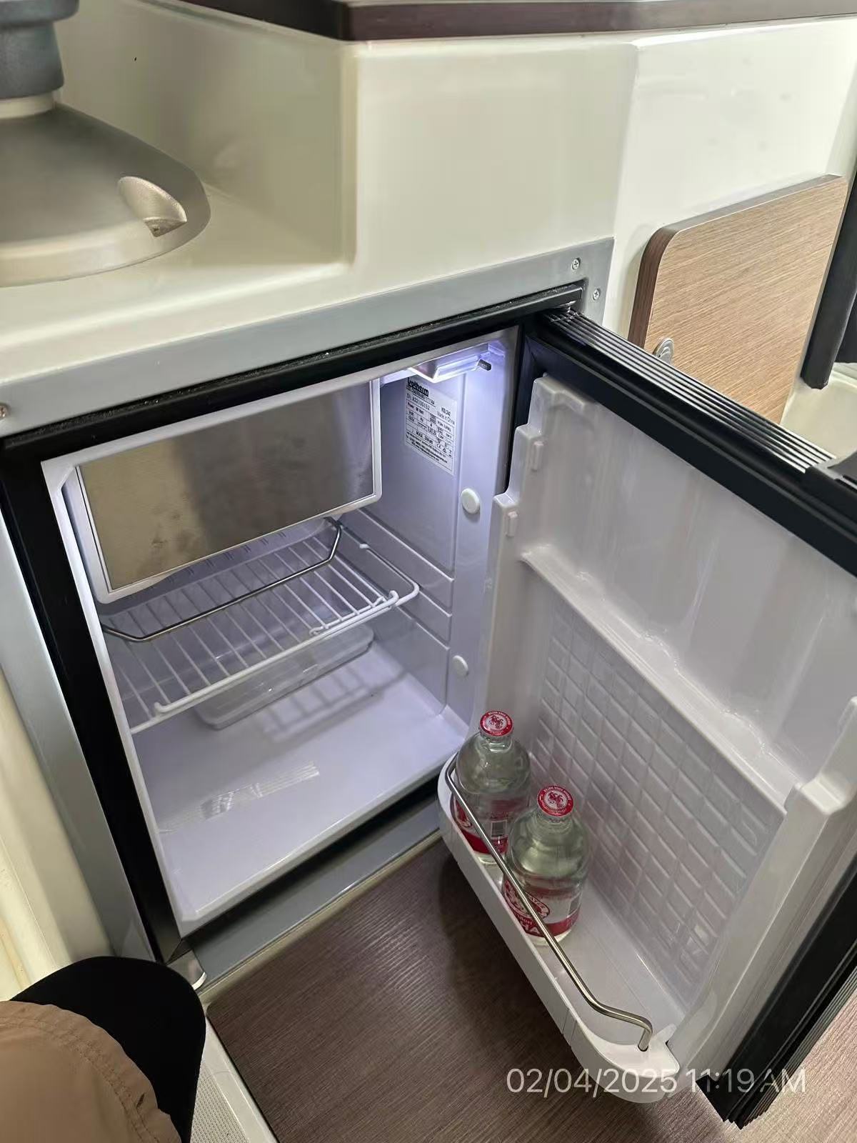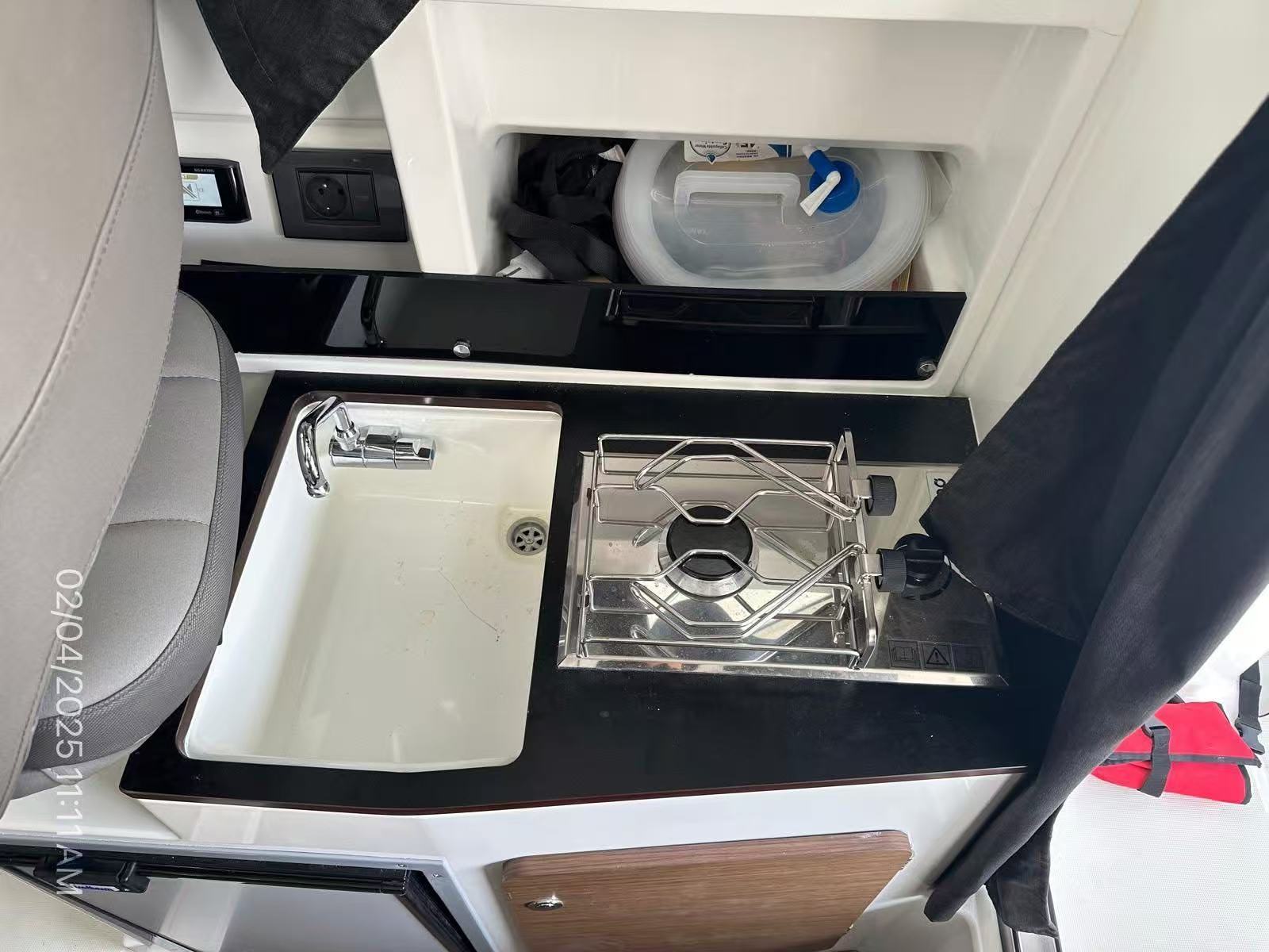 簡易廚房 (Galley): 駕駛座後方設有洗手槽、冰箱和爐具位置。