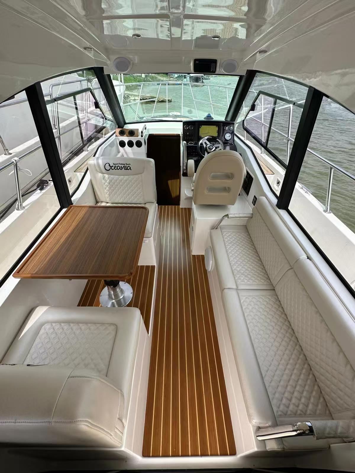 硬頂設計: 船隻擁有一個固定式硬頂,提供駕駛艙和沙龍區域的遮陽和保護。